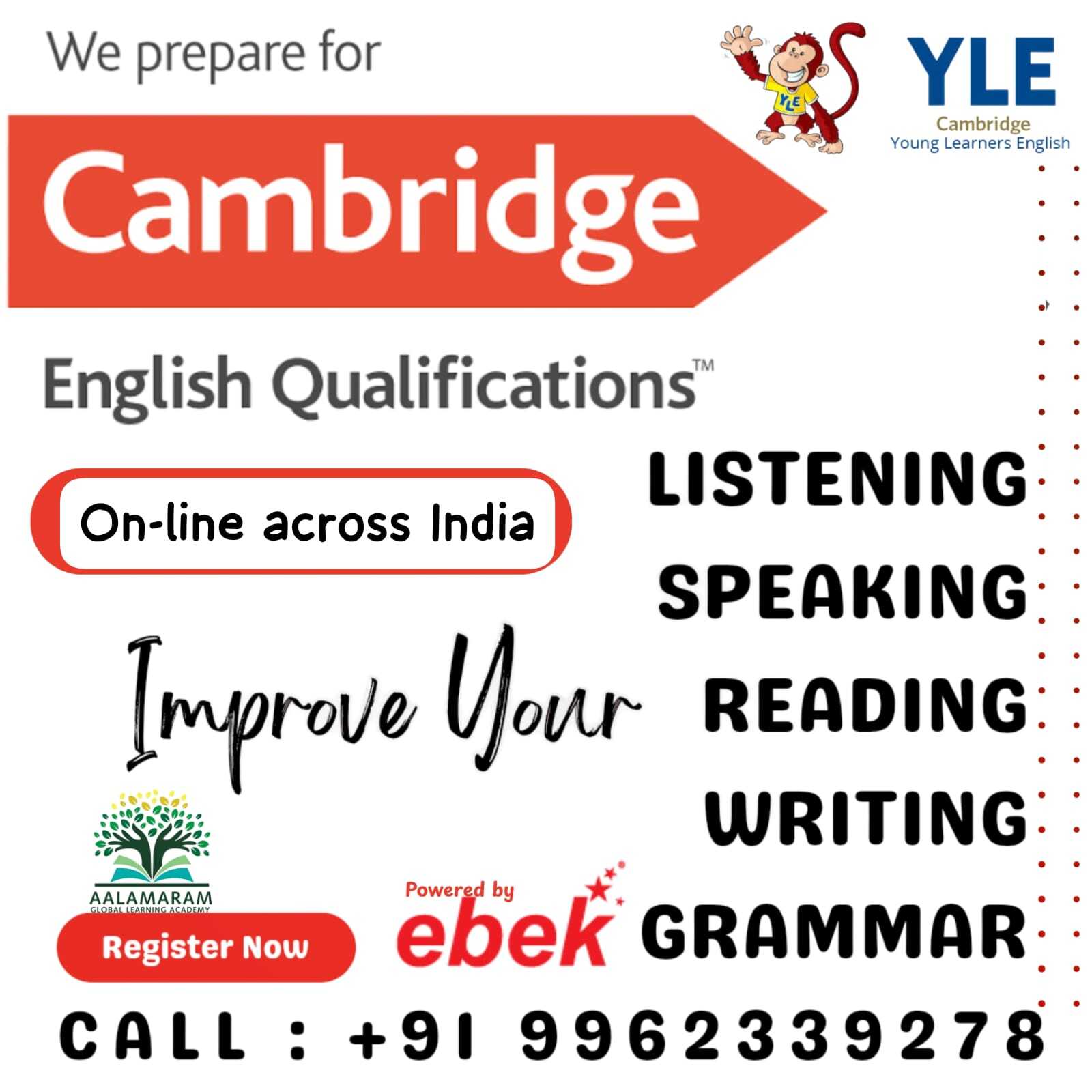 Aalamaram Global Learning Academy offers comprehensive preparation for the Cambridge Young Learners English Qualifications through online classes across India. Our program focuses on developing essential language skills, including Listening, Speaking, Reading, Writing, and Grammar, to help students excel in their exams and build confidence in English.