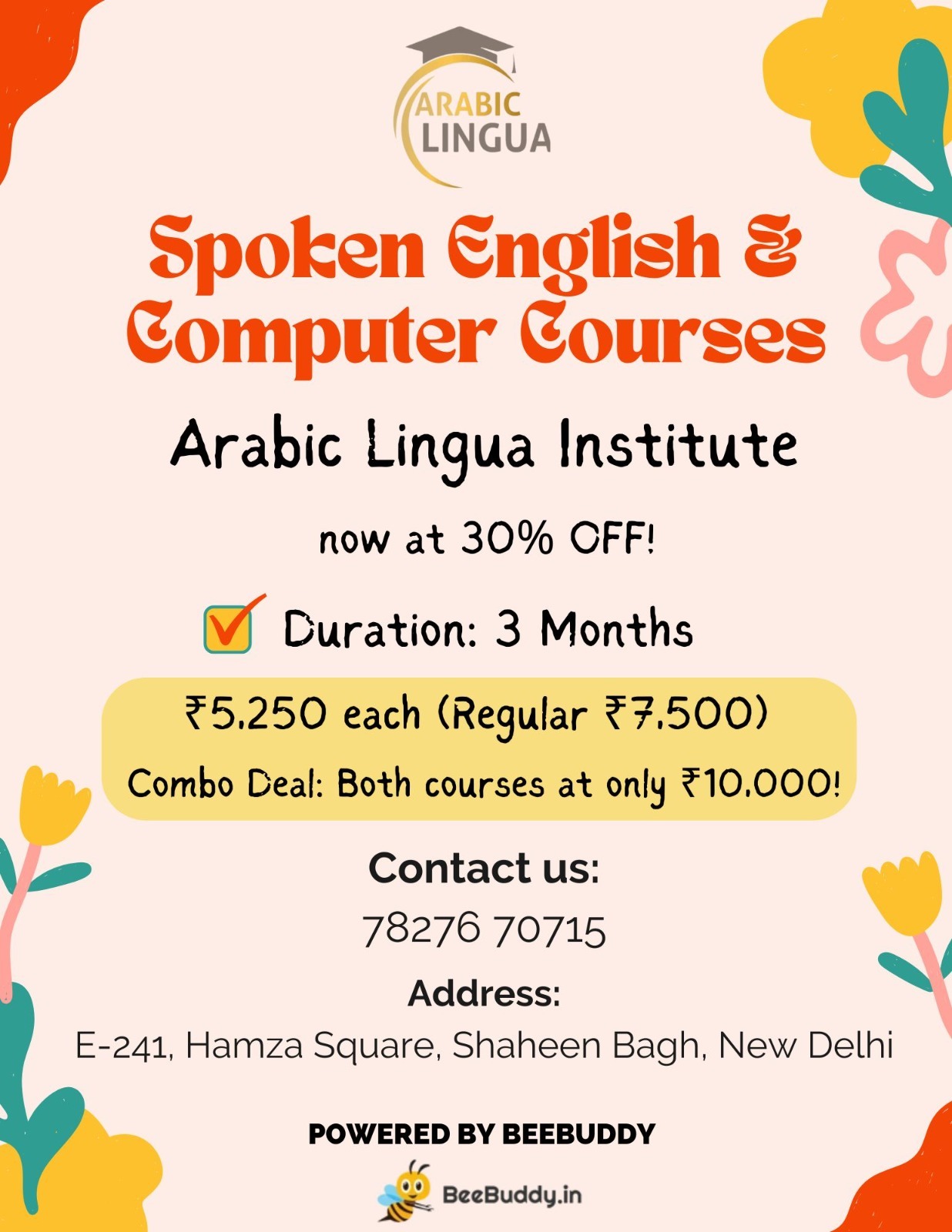 Enhance your child’s communication and digital skills with our 3-month Spoken English and Computer Courses at Arabic Lingua Institute. Designed to build fluency, confidence, and essential computer knowledge, these courses are ideal for young learners. Now available at a 30% discount, with an option to enroll in both at a special combo price.