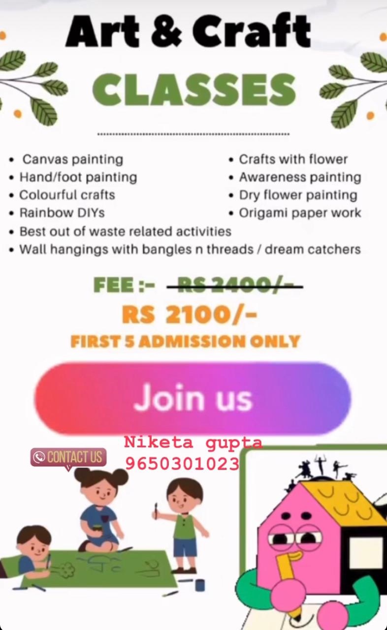 Enroll Now! đ Step into a world of creativity with our Art & Craft classes! From beginners to art enthusiasts, thereâs something for everyone. Let your creativity shine bright and join our community today! đ Sign up now and start your colorful journey!
