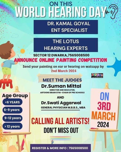 Artoons is hosting an online painting competition focused on ear or hearing themes, organized by Dr. Kamal Goyal, an ENT specialist, and The Lotus Hearing Experts, meant for children. The event highlights an exciting chance for young artists to showcase their creativity under the judgment of esteemed professionals like Dr. Suman Mittal and Dr. Swati Aggarwal.