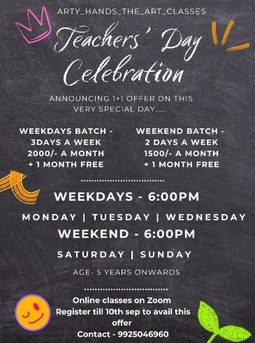 Arty Hands – The Art Classes invites young artists to celebrate creativity this Teachers’ Day with an exciting 1+1 Offer. Enroll in our engaging art sessions designed to build imagination, drawing, and craft skills. Choose from weekday or weekend batches and enjoy a free additional month with your registration. Whether your child is a beginner or already loves drawing, these fun and structured classes will enhance artistic expression and confidence.