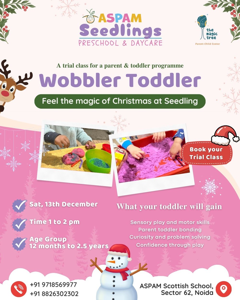 Experience the magic of Christmas at ASPAM Seedlings Preschool & Daycare: The Magic Tree, Parent-Child Center. We invite parents and toddlers aged 12 months to 2.5 years to join us for a special trial class of our Parent & Toddler Program, Wobbler Toddler, designed to foster curiosity, confidence, and bonding through play.