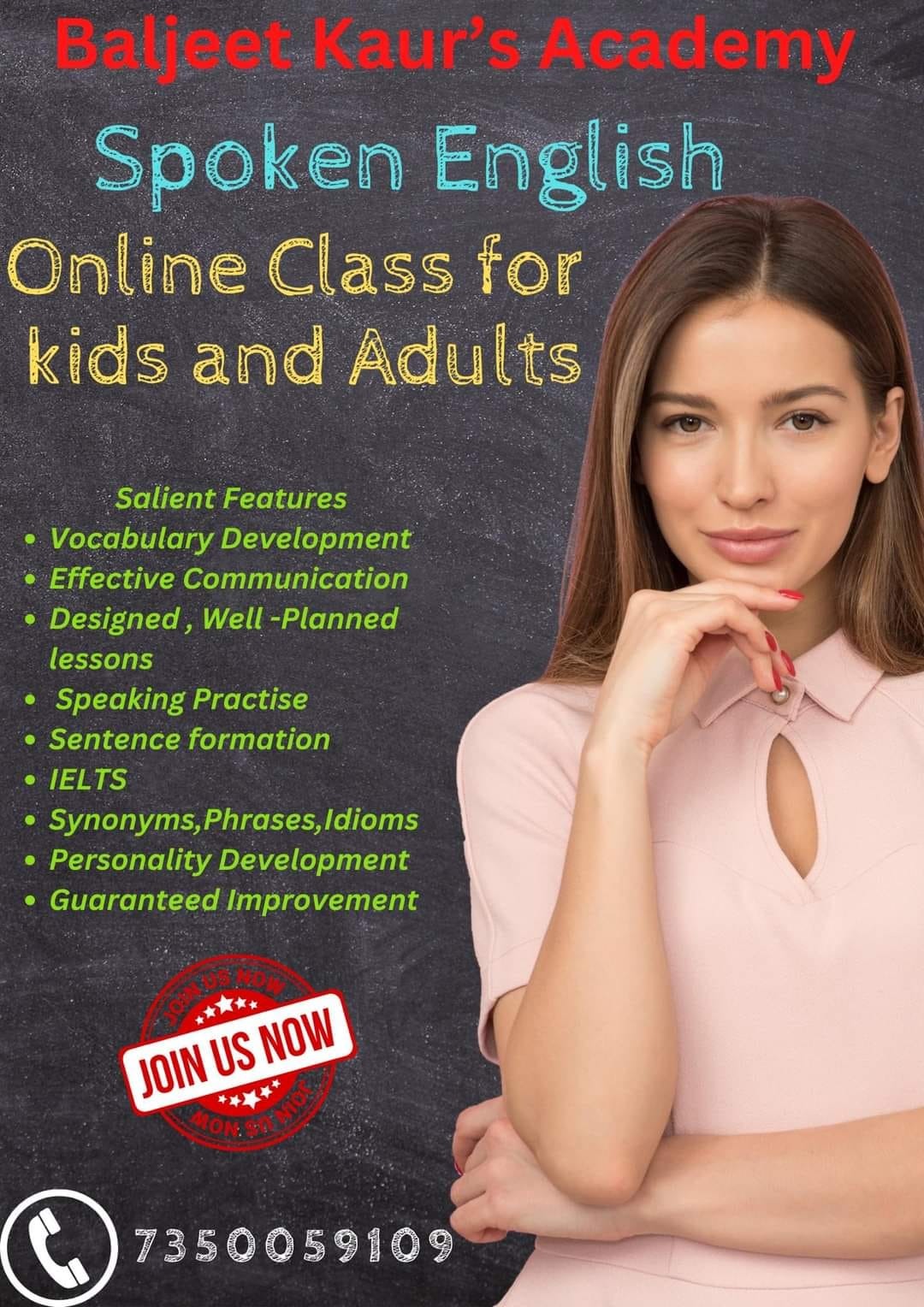 Improve your English language skills with Baljeet Kaur’s Academy’s Spoken English Online Classes, designed for both kids and above. The program covers vocabulary development, effective communication, speaking practice, sentence formation, synonyms, phrases, idioms, and personality development. With well-planned lessons and structured activities, the course ensures guaranteed improvement, whether for academic purposes, professional growth, or IELTS preparation.