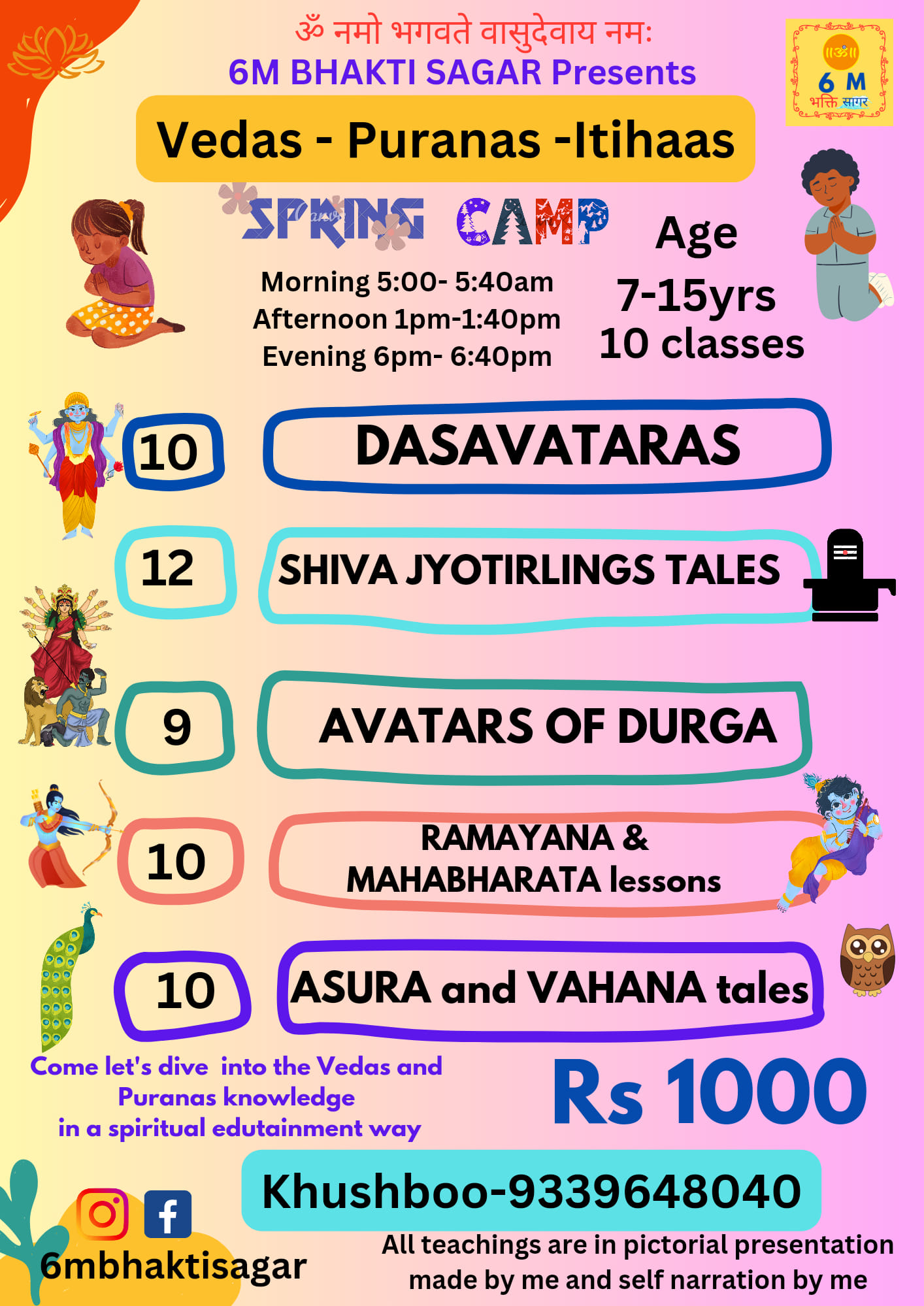 Bhakti Sagar Hosted Spring Camp For Kids Enroll Your Child Now Highlights đ 10 DASAVATARAS đż 12 SHIVA JYOTIRLINGS TALES đş 9 AVATARS OF DURGA đ 10 RAMAYANA & MAHABHARATA lessons đš 10 ASURA and ⨠VAHANA tales đ Vedas - đ Puranas -đ°ď¸ Itihaas đ Come let's dive into the Vedas and Puranas knowledge in a spiritual edutainment way đźď¸ All teachings are in pictorial presentation made by me and đď¸ self narration by me