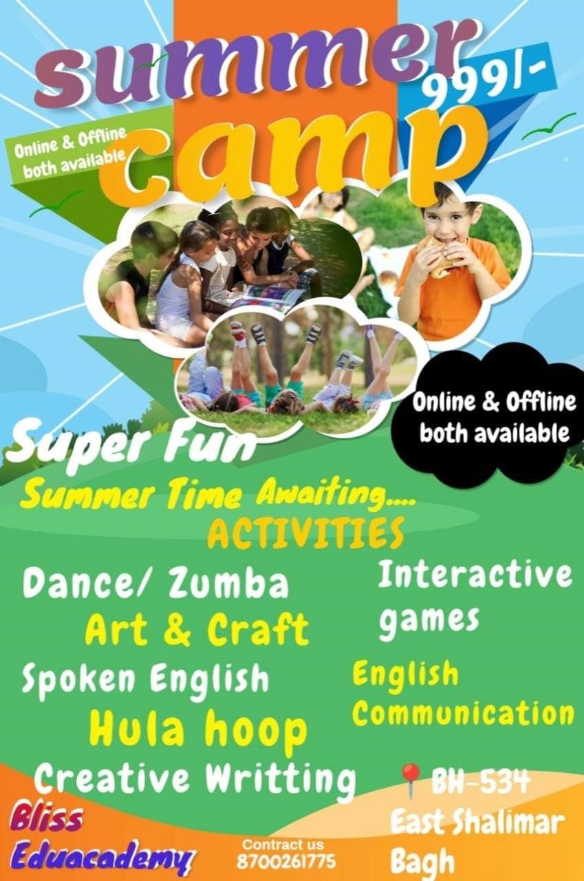 - Join the super fun Summer Camp at Bliss Eduacademy featuring a variety of activities like Zumba, Art, English lessons, and more! đŻđď¸đ
