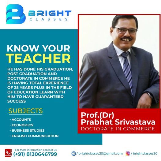 - Meet Prof. (Dr) Prabhat Srivastava, with a Doctorate in Commerce, specialized in teaching đ§ž Accounts, đ Economics, đ Business Studies, and đŁ English Communication.