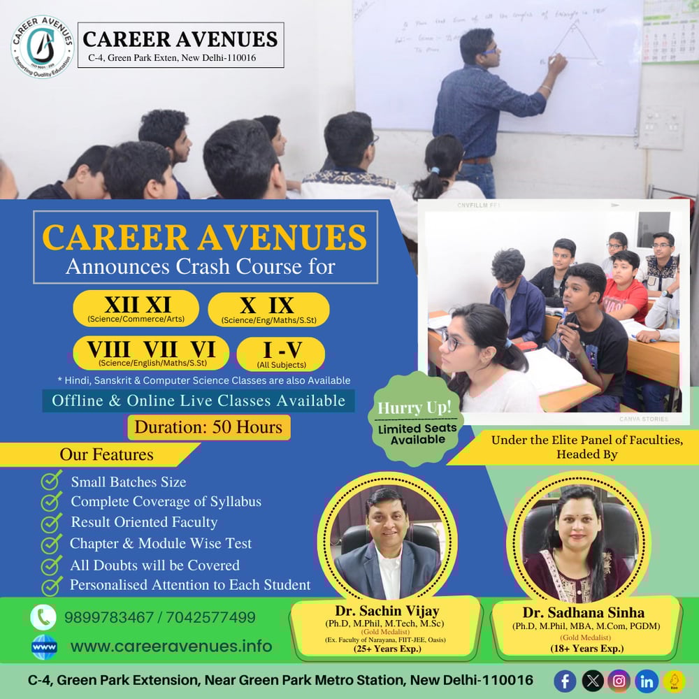 Career Avenues Hosted Crash Course - For Class Vth-XIIth For Students đ Enroll Your Child Now đ Highlights: Our Features: đĽ Small Batches Size đ Complete Coverage of Syllabus đŻ Result Oriented Faculty đ Chapter & Module Wise Test â All Doubts will be Covered đŠâđŤ Personalised Attention to Each Student đ§Ş XII XI (Science/Commerce/Arts) đ VIII VII VI (Science/English/Maths/S.St) đ X IX (Science/Eng/Maths/S.St) đ I-V (All Subjects) đ Hindi, Sanskrit & Computer Science Classes are also Available Under the Elite Panel of Faculties, Headed By: đ¨âđ Dr. Sachin Vijay (Ph.D, M.Phil, M.Tech, M.Sc) (Gold Medalist) (Ex. Faculty of Narayana, FIIT-JEE, Oasis) (25+ Years Exp.) đŠâđ Dr. Sadhana Sinha (Ph.D, M.Phil, MBA