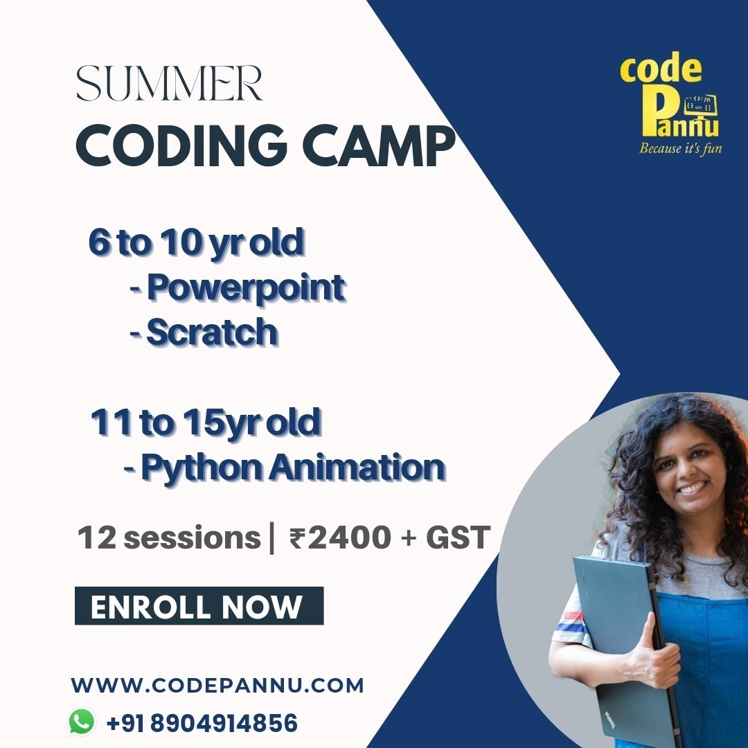 Summary: This summer, join Code Pannu's Coding Camp where kids can enjoy 1ď¸âŁ2ď¸âŁ creative sessions involving đ PowerPoint, đą Scratch, and đ Python Animation.