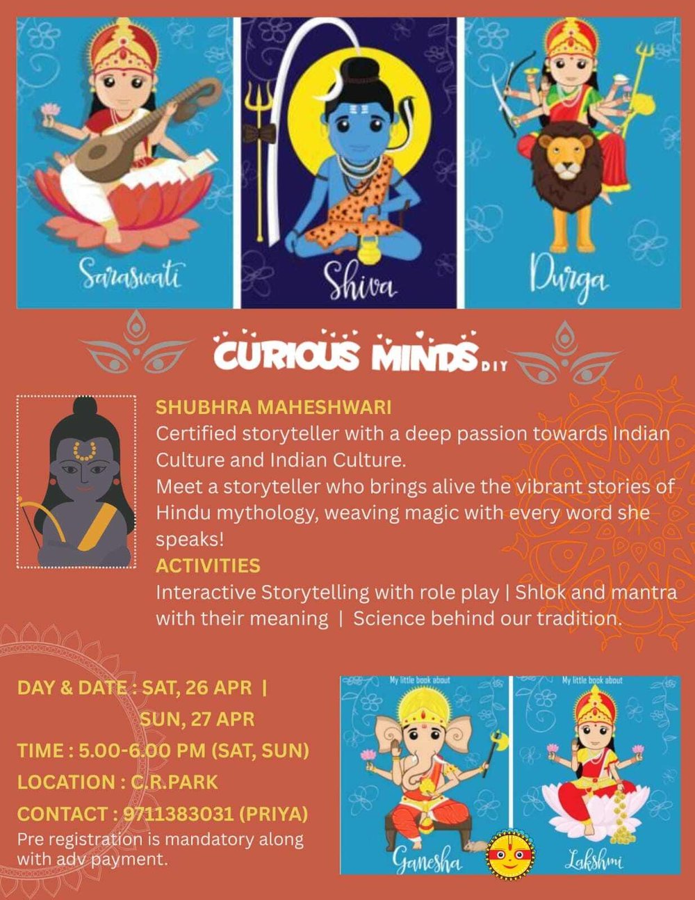 Join us for an engaging session with a storyteller who brings the vibrant tales of Hindu mythology to life, weaving magic with every word she speaks.