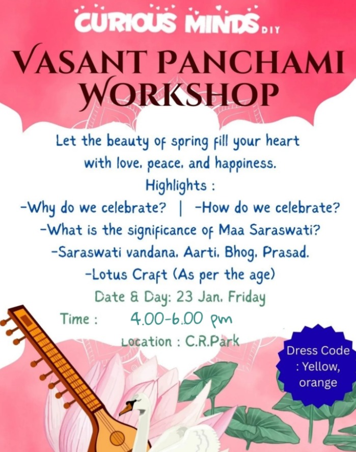 Join us at Curious Minds DIY Vasant Panchami Workshop to celebrate the arrival of spring with love, peace, and happiness. This special event is designed to introduce children to the cultural and spiritual significance of Vasant Panchami and Maa Saraswati through engaging discussions and creative activities.