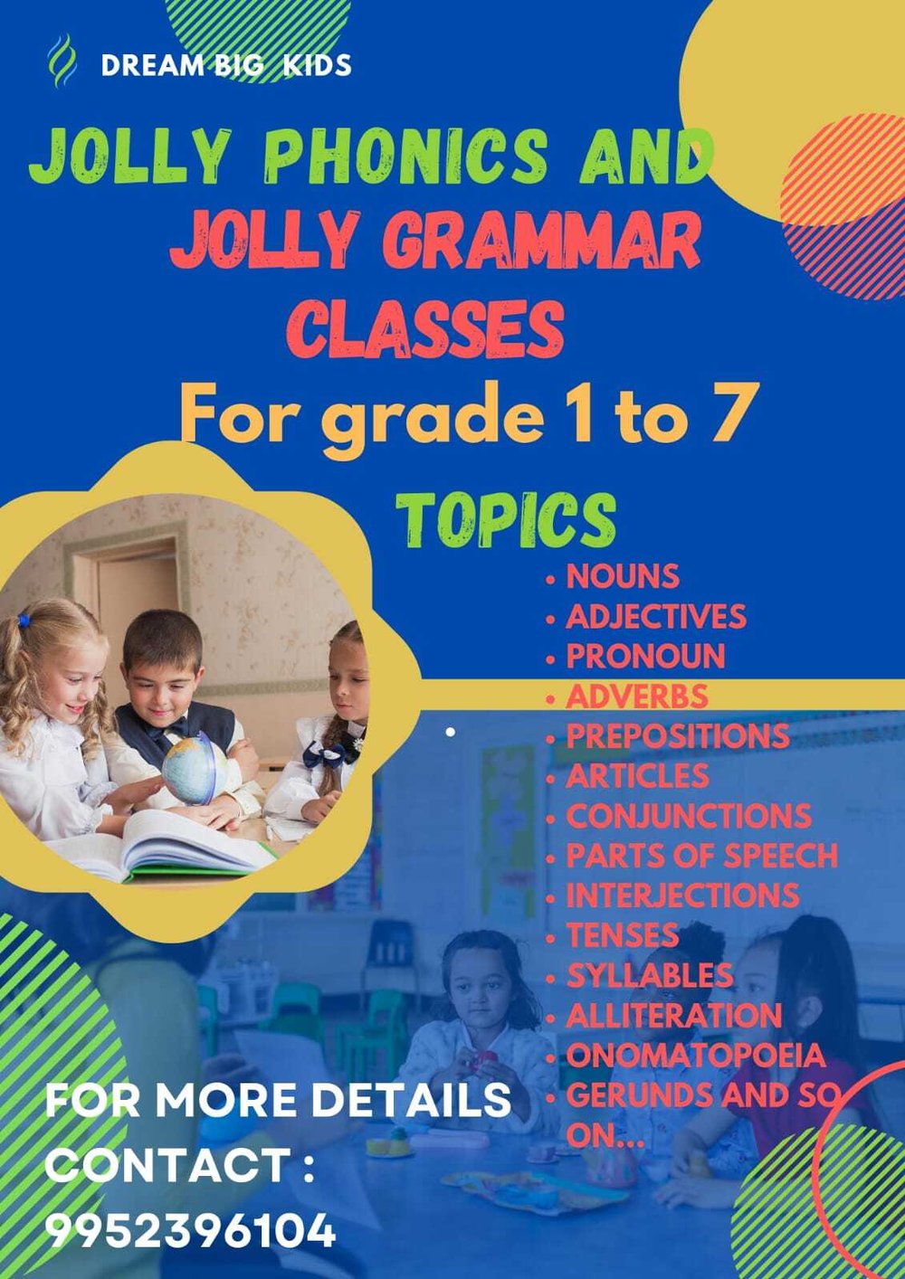 Dream Big Kids presents Jolly Phonics and Jolly Grammar classes specially designed for students from grade 1 to 7.