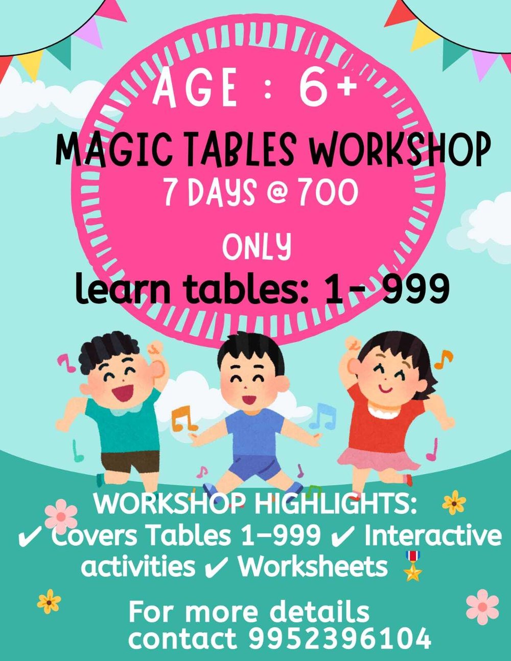 The workshop features engaging activities, worksheets, and hands-on exercises that make learning multiplication quick and easy. Our approach ensures that children not only memorize the tables but also understand and apply them confidently. The entire program is available at an affordable fee of only 700.
