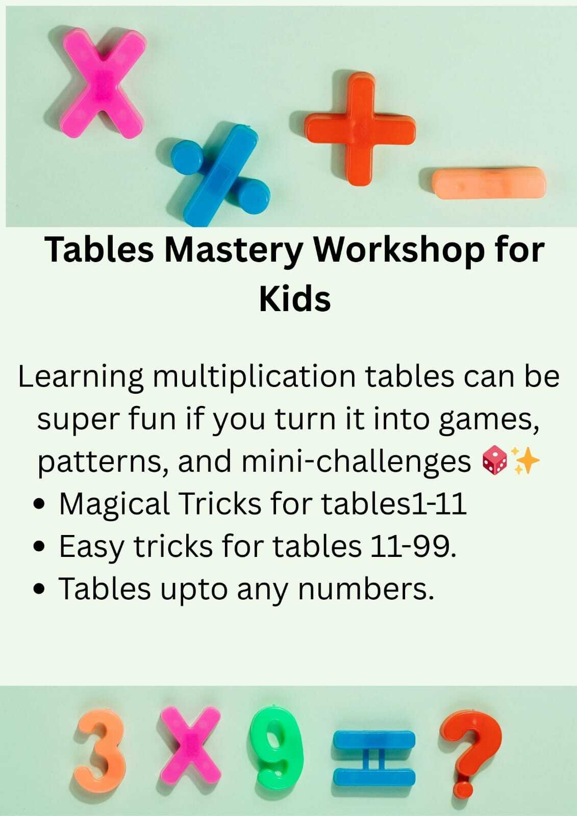 The Tables Mastery Workshop for Kids is designed to make multiplication easy, fun, and engaging through games, patterns, tricks, and mini challenges.