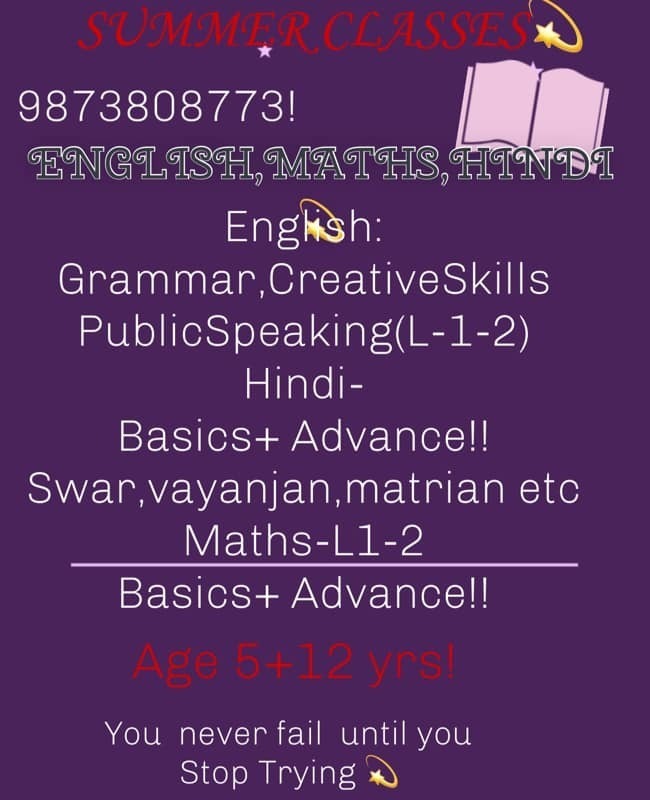 Summary: Join our Summer Classes to enhance your child's English, Hindi, and Math skills! đ From grammar to public speaking and from basic math to advanced concepts, we have it all. đđ
