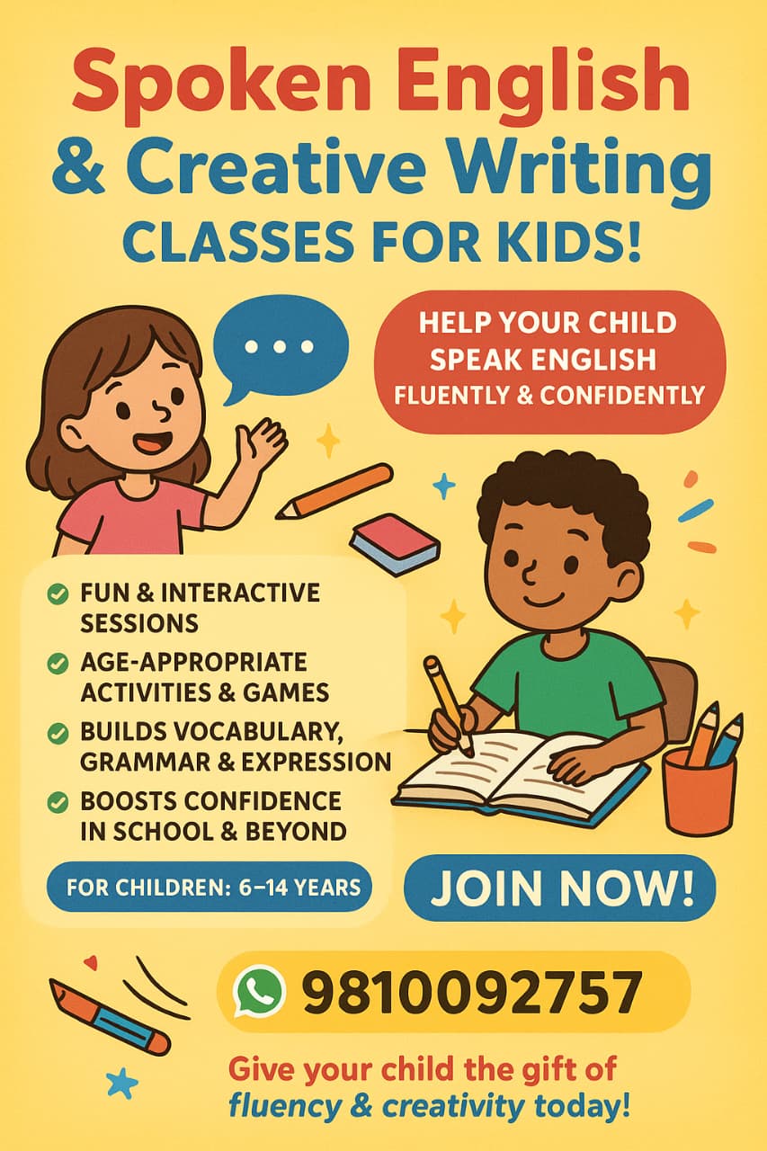Fun and interactive classes designed to help children speak English fluently and confidently. Through engaging activities, age-appropriate games, and guided practice, kids will strengthen their vocabulary, grammar, and expression. The program also develops creative writing skills, encouraging children to express their thoughts and ideas with clarity.These sessions focus on boosting confidence, improving communication, and building strong language foundations that benefit children in school and beyond.