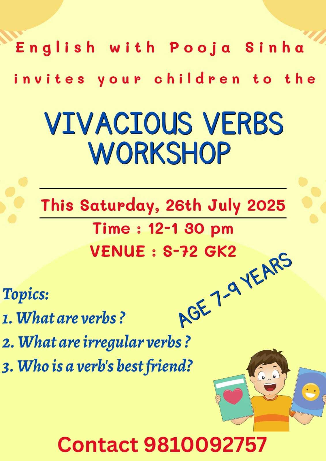 English with Pooja Sinha presents the Vivacious Verbs Workshop – a fun-filled, interactive grammar session specially designed for kids. This workshop aims to make the concept of verbs exciting and easy to understand through engaging discussions and creative activities.This session is structured to promote learning through participation, helping young minds strengthen their language skills in a joyful and effective manner.