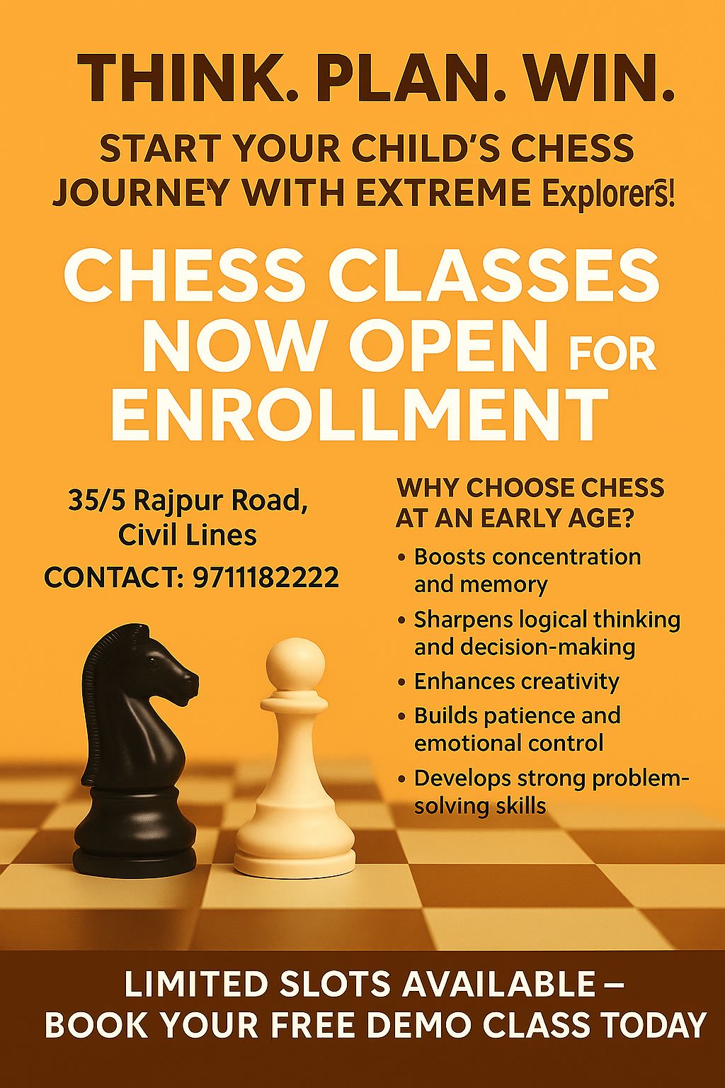 Extreme Explorers invites young minds to begin their chess journey with structured, certified training. Specially designed for children, these classes aim to enhance concentration, memory, logical thinking, creativity, and patience. Through engaging sessions, to develop strong decision-making and problem-solving skills while learning chess strategies from the basics to advanced techniques. They are also provide a free demo for chess class, giving parents and childern an opportunity to experience the learning approach before enrolling. Limited slots are available to ensure personalized attention for each participant.