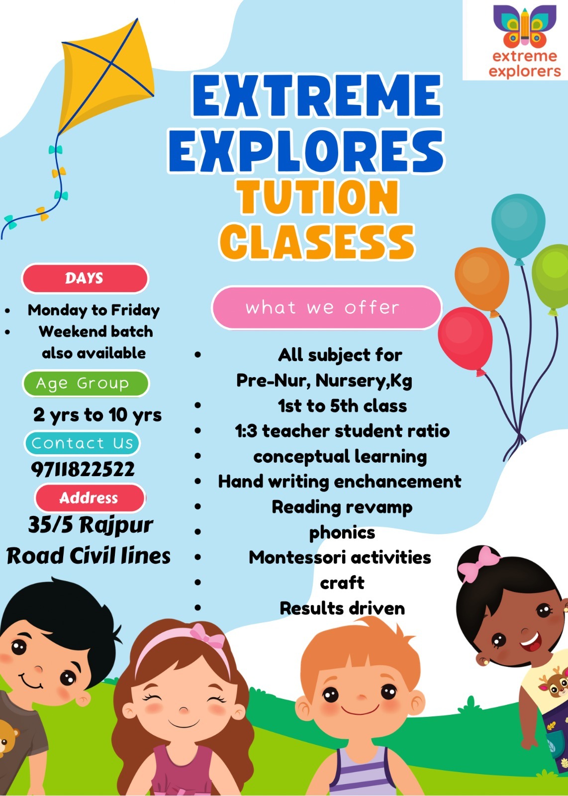 Extreme Explorers offers focused and engaging tuition classes for children, covering all subjects from Pre-Nursery to Class 5. With a low teacher-student ratio of 1:3, each child receives personalized attention Monday to Friday (Weekend batch also available). The program emphasizes conceptual learning, phonics, reading skills, handwriting enhancement, Montessori activities, and craft-based learning for overall development