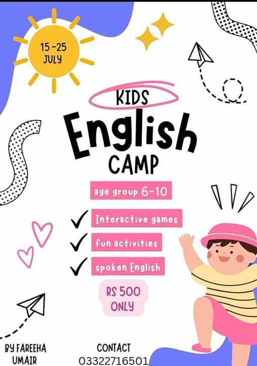 Summary: Fareeha Umairâs English Camp offers an energetic setting for kids to play and learn đ. This program includes interactive games, creative activities, and spoken English practices to promote both fun and educational growth.