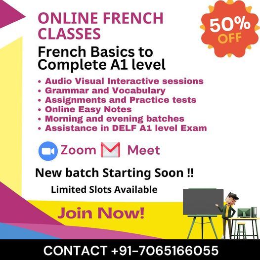 Learn French from basics up to A1 level through engaging online audiovisual sessions, interactive grammar, and vocabulary exercises. Get support in assignments, practice tests, and the DELF A1 level exam.
