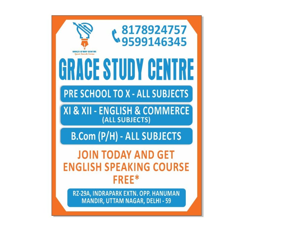 đ Summary: Grace Study Centre offers comprehensive tuition classes for students from preschool to B.Com, covering all subjects, including specialized classes for English and Commerce in senior grades. Enroll today and receive a free English speaking course!