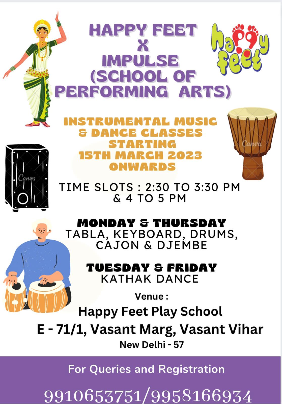 Summary Join IMPULSE School of Performing Arts and Happy Feet Play School for exciting instrumental music and dance classes. Explore and express through the wonderful world of arts! đźđ