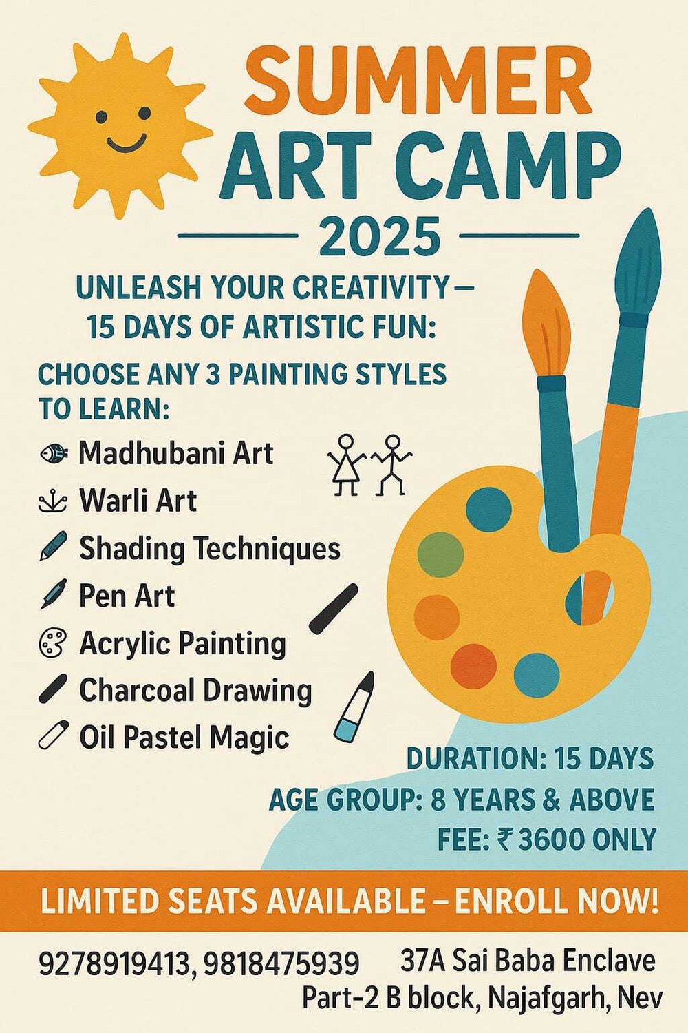Join the Summer Art Camp 2025 and dive into artistic exploration. Participants can choose any 3 painting styles to master from a variety of options including Madhubani Art, Warli Art, Shading Techniques, Pen Art, Acrylic Painting, Charcoal Drawing, and Oil Pastel Magic. This engaging program is perfect for young artists looking to enhance their skills and creativity in a guided, hands-on environment.