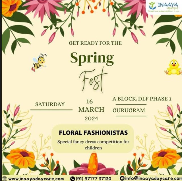 Summary: Join us for the Spring Fest at Inaya Daycare, featuring the Floral Fashionistas fancy dress competition for children. It's the perfect occasion for kids to showcase their creative outfits inspired by flowers!