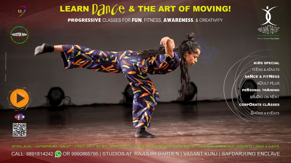 India Dans Theater Hosted Learn Dance N The Art of Moving For Kids Teens & Adults Enroll Now Highlights đš PROGRESSIVE CLASSES FOR FUN đ FITNESS đŞ AWARENESS đ§ & CREATIVITY đ¨ đš KIDS SPECIAL đ§ đš TEENS & ADULTS đŤ đš DANCE & FITNESS đđžđď¸ââď¸ đš ADULT PLUS đľđ´ đš PERSONAL TRAINING đď¸ đš STUDIO ON RENT đ˘ đš CORPORATE CLASSES đ đš SHOWS & EVENTS đ đš MOVING ALIVE CONTEMPORARY đ STREET đŚ JAZZ/HIP HOP đˇđ BOLLYWOOD đŹ FUNK đ¸ DANCE PRO đş CHOREOGRAPHY COMPOSITION đś PERFORMANCE đ RESEARCH WORKSHOPS đ I SHOWS+EVENTS đď¸