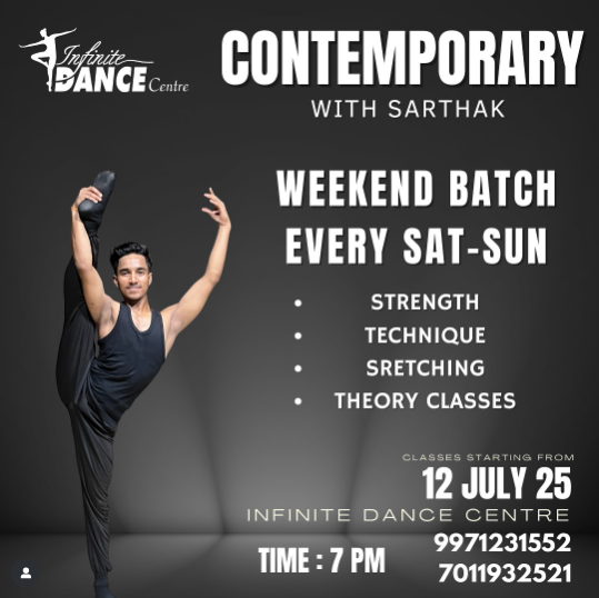 Join the Contemporary Dance Weekend Batch at Infinite Dance Centre with Sarthak. This program focuses on building strength, technique, flexibility through stretching, and includes theory classes to deepen your understanding of contemporary dance. Designed for passionate learners, this batch offers structured weekend training in a creative environment.