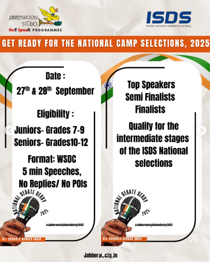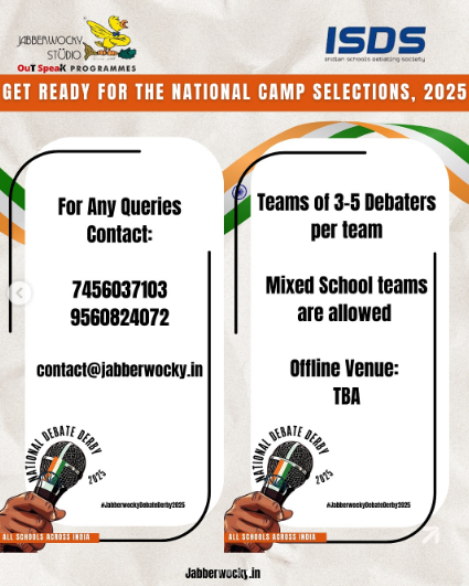 The Debate Derby 2025, organized by Jabberwocky Studio in collaboration with the Indian Schools Debating Society (ISDS), is an exciting national-level debating event that serves as the gateway to the ISDS National Camp Selections.
