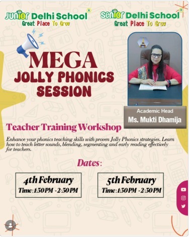 Join us at Junior Delhi School, a great place to grow, for the Mega Jolly Phonics Session designed to enhance your teaching skills in early literacy. Learn effective techniques to teach letter sounds, blending, segmenting, and early reading skills, empowering you to foster confident readers in your classroom.
