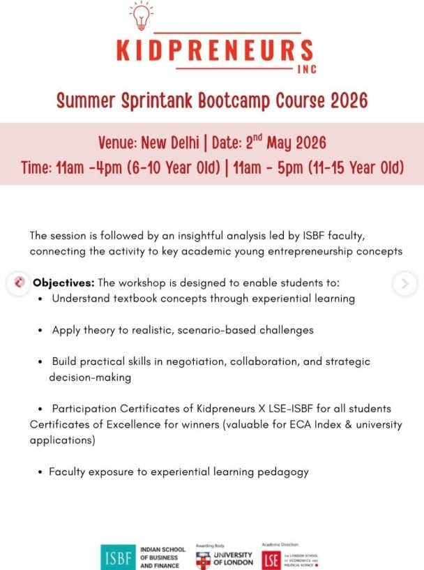 Designed for children, the program combines hands-on activities, business simulations, negotiation exercises, and idea pitching to build real-world skills in communication, strategic thinking, and collaboration. Led in association with Indian School of Business and Finance and London School of Economics, the bootcamp offers a fun and practical learning experience along with participation certificates and awards for top performers.