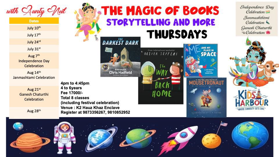 Step into a world of wonder with “The Magic of Books – Storytelling and More,”. Designed for children, this engaging program blends captivating stories with vibrant themes such as Independence Day, Janmashtami, and Ganesh Chaturthi. Across eight sessions, children will explore books like The Darkest Dark, The Way Back Home, Me and My Place in Space, and Mousetronaut, while celebrating curiosity, imagination, and cultural values. The sessions are thoughtfully planned to nurture young minds through stories, discovery, and creative exploration.
