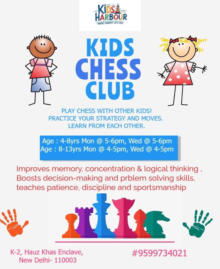 Join the Kids Chess Club at Kids Harbour! This engaging activity is designed for ages 4-8 years. Classes are held on Mondays from 5-6 PM and Wednesdays from 5-6 PM. Located in Hauz Khas Enclave, New Delhi, this club focuses on improving memory and logical thinking through chess. For more information, contact 9599734021.