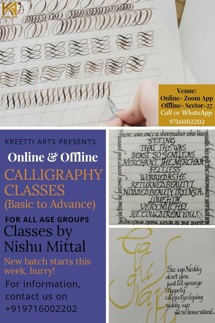 Summary: đ¨ Kreetti Arts presents calligraphy classes for all ages. đď¸ From basic to advanced levels, guided by Nishu Mittal.