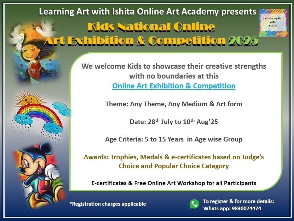 Learning Art with Ishita – Online Art Academy presents a creative platform for young artists across the nation. The Kids National Online Art Exhibition & Competition 2025 invites participants to showcase their imagination through any theme, medium, or form. Every participant receives an e-certificate and access to a free online art Exhibition & Competition . Winners will be awarded trophies, medals, and special recognition under Judge's Choice and Popular Choice categories. Let your child’s creativity shine beyond boundaries.