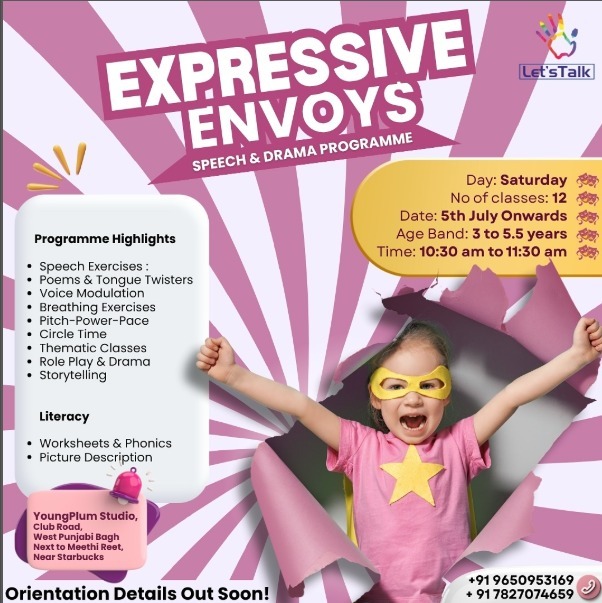 Let’sTalk presents ENVOYS – Expressive Speech & Drama, a personality development programme specially curated for children . Held every Saturday, the programme blends speech exercises, voice modulation, poems, tongue twisters, breathing techniques, and circle time with engaging activities like role play, storytelling, phonics, worksheets, and picture description. Through 12 interactive classes, children receive a nurturing environment to build confidence, improve communication, and grow socially and emotionally. Orientation details will be shared soon.