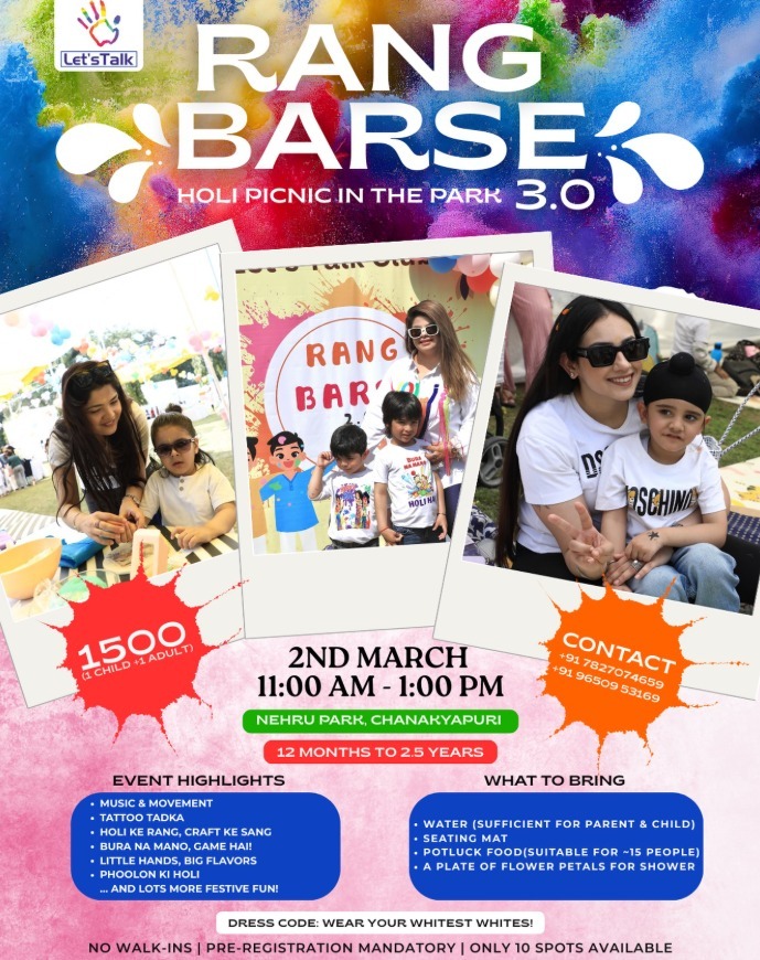 Join us for "Rang Barse", Holi Picnic in the Park 3.0, a vibrant and joyful celebration of Holi! This event is specially designed for children aged 12 months to 2.5 years and their parents, offering a morning filled with festive fun, music, and creative activities.