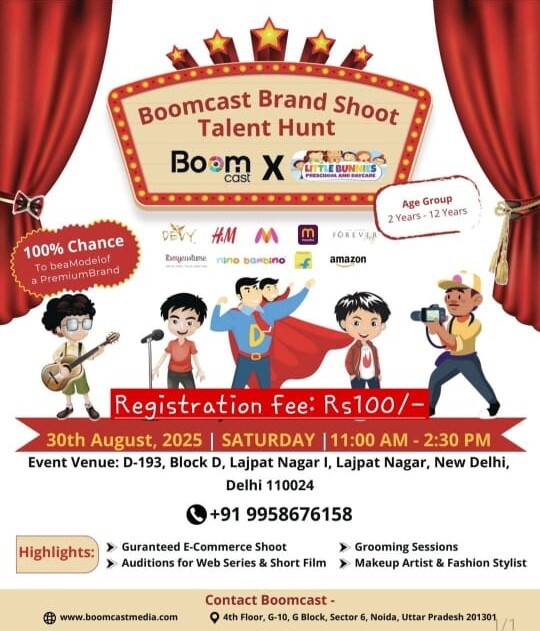 Boomcast Media presents the Boom X Talent Hunt – Little Bunnies Cast, an exciting opportunity for children to explore the world of modeling and performance. Open to kids , this event offers a 100% guaranteed e-commerce brand shoot along with grooming sessions, auditions for web series & short films, and access to professional makeup artists and fashion stylists. It’s a unique platform where children can showcase their talent, build confidence, and step into the world of premium brands.