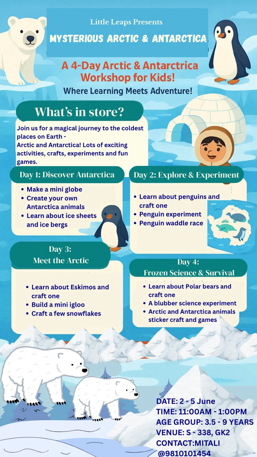 Get ready for a magical journey to the coldest corners of the Earth! Little Leaps invites curious young minds to explore the wonders of the Arctic and Antarctica through an exciting, hands-on workshop. Over four thrilling days, children will dive into icy adventures with engaging activities, science experiments, themed crafts, and fun games that bring polar regions to life.