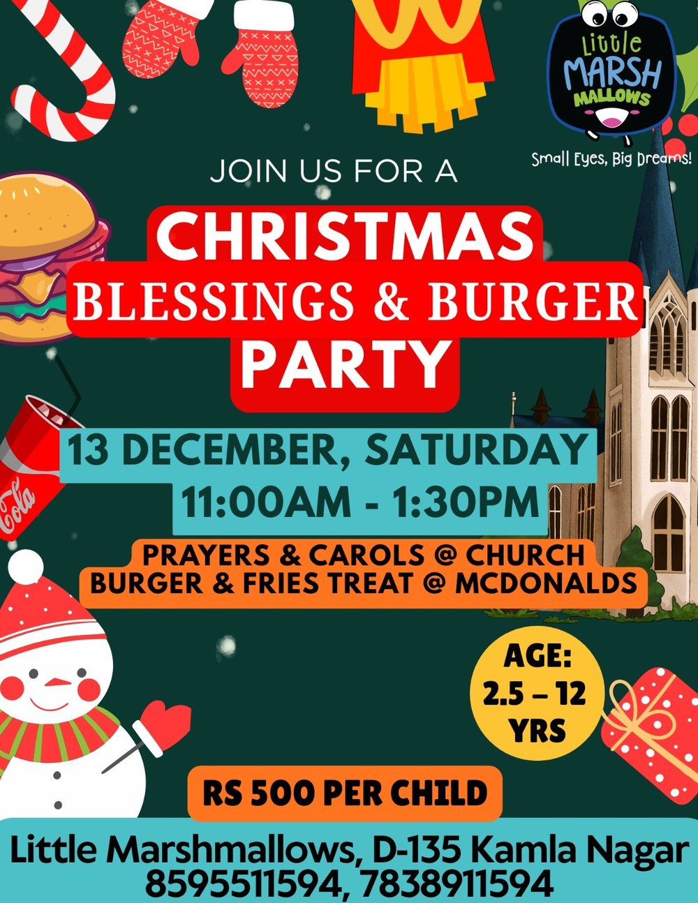 Join Little Marshmallows for a joyful Christmas Blessings & Burger Party on Saturday. Designed for children aged 2.5 to 12 years, this fun-filled event features prayers, carols, and festive cheer to celebrate the holiday season.