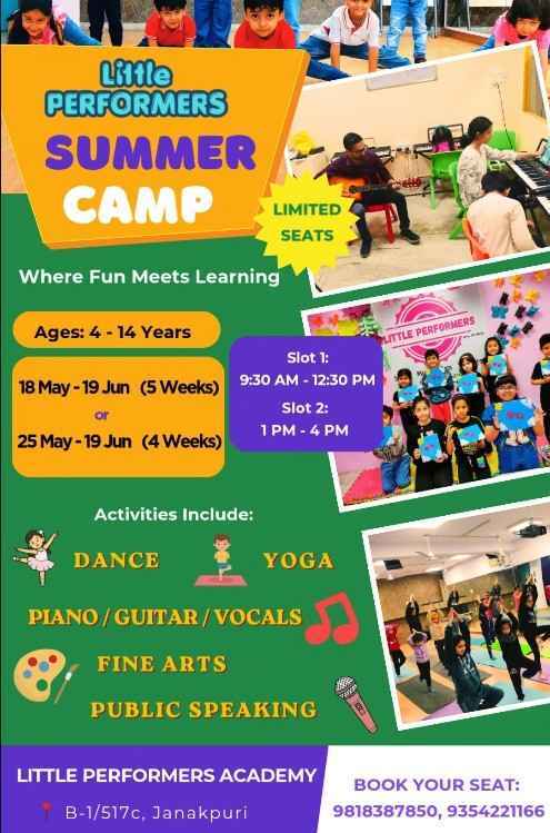 Specially designed for children, this engaging camp offers the perfect combination of performing arts, creativity, fitness, and confidence-building in a fun filled environment.Children will explore a wide range of enriching activities including Dance, Yoga, Piano, Guitar, Vocals, Fine Arts, and Public Speaking helping them discover new talents, build self-confidence, improve communication skills, and enjoy a summer full of growth and expression.