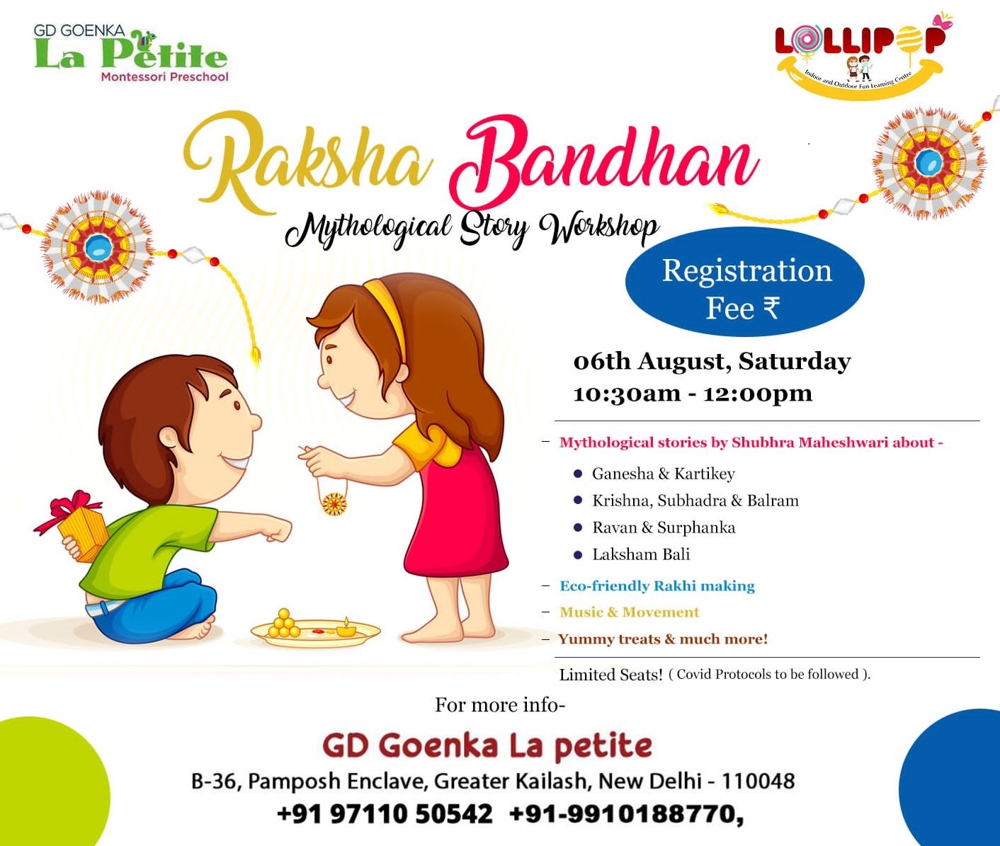đ Rakhshabandhan Event Hosted Lollipop đ đ Enroll Your Child đ Mythological Stories By Shubhra Maheshwari about- đ Ganesha & Kartikey đĄď¸ đ Krishna, Subhadra & Balram đĄď¸ đš Ravan & Surphanka đ đš Laksham Bali đ đż Eco-Friendly Rakhi Making đą đś Music and Movement đđş đŞ Yummy Treats and Much More đ