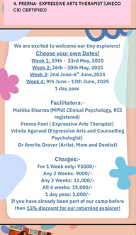 Mindward warmly welcomes young adventurers to the Tiny Explorers Summer Camp â a thoughtfully designed program focused on creativity, emotional growth, and joyful learning. Led by a team of certified mental health professionals and expressive arts specialists, the camp offers live music, drama, art, play, and therapeutic engagement, ensuring a rich developmental experience for each child. Choose your own dates with flexible pass options and let your little one explore, express, and grow in a nurturing environment.