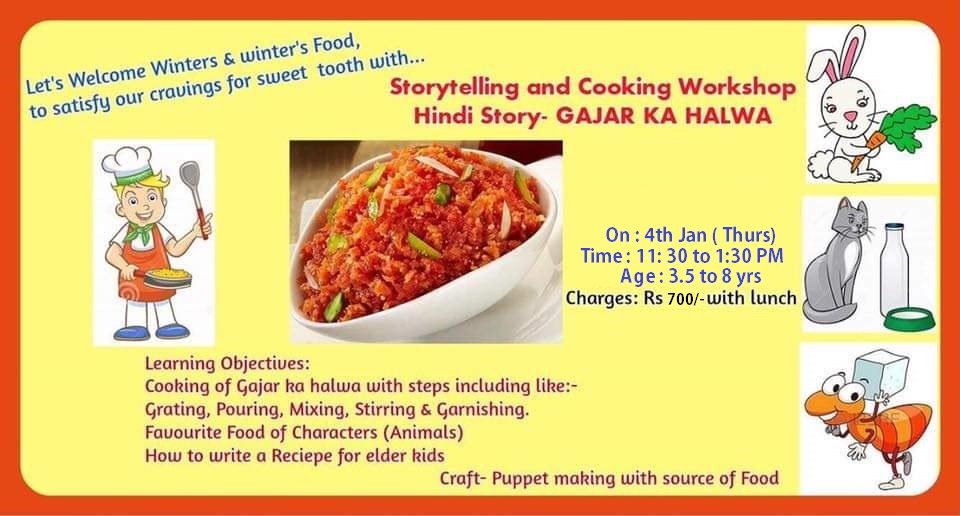 đ This workshop combines storytelling with a cooking session focused on making Gajar ka Halwa, a delicious winter treat. đ¨ Children will also learn to write recipes, understand their favorite characters' favorite foods, and engage in puppet-making.