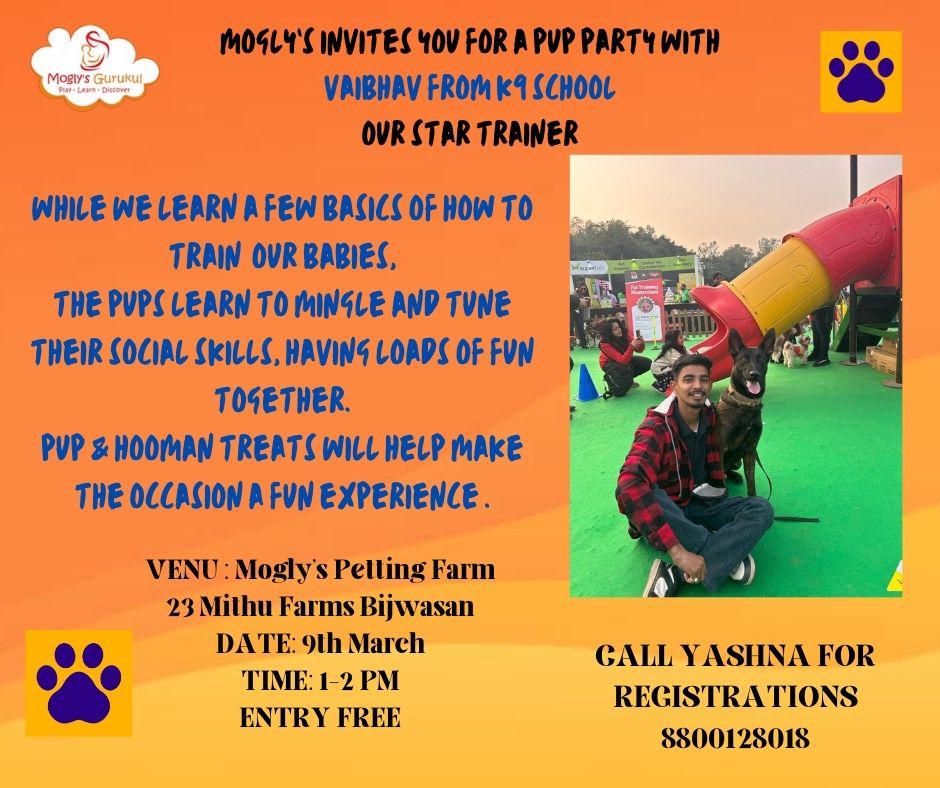đžđ Moglys Gurukul Hosted Pup Party with VAIBHAV FROM K9SCHOOL OUR STAR TRAINER đ Enroll Now Highlights đś WHILE WE LEARN A FEW BASICS OF HOW TO TRAIN OUR BABIES, đ THE PUPS LEARN TO MINGLE AND TUNE THEIR SOCIAL SKILLS, HAVING LOADS OF FUN TOGETHER. đŞđ§ PUP & HOOMAN TREATS WILL HELP MAKE THE OCCASION A FUN EXPERIENCE.