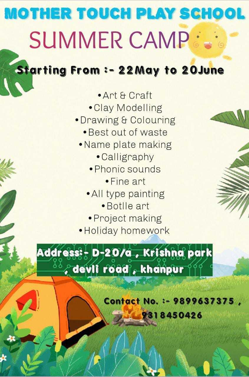đ Summary: Mother Touch Play School is organizing a summer camp packed with creative and educational activities like art and crafts, painting, clay modelling, and more, designed to engage and inspire children.