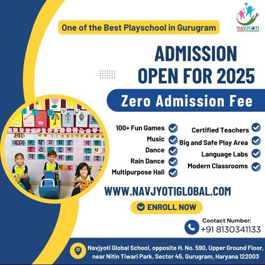 Navjyoti Global Playschool in Gurugram offers a nurturing and fun environment for early learners with zero admission fee. The school features certified teachers and a wide range of engaging activities including over 100 fun games, music classes, dance sessions, and language labs. Children enjoy a large, safe play area, rain dance, modern classrooms, and a multipurpose hall, all designed to support holistic development in a secure setting.