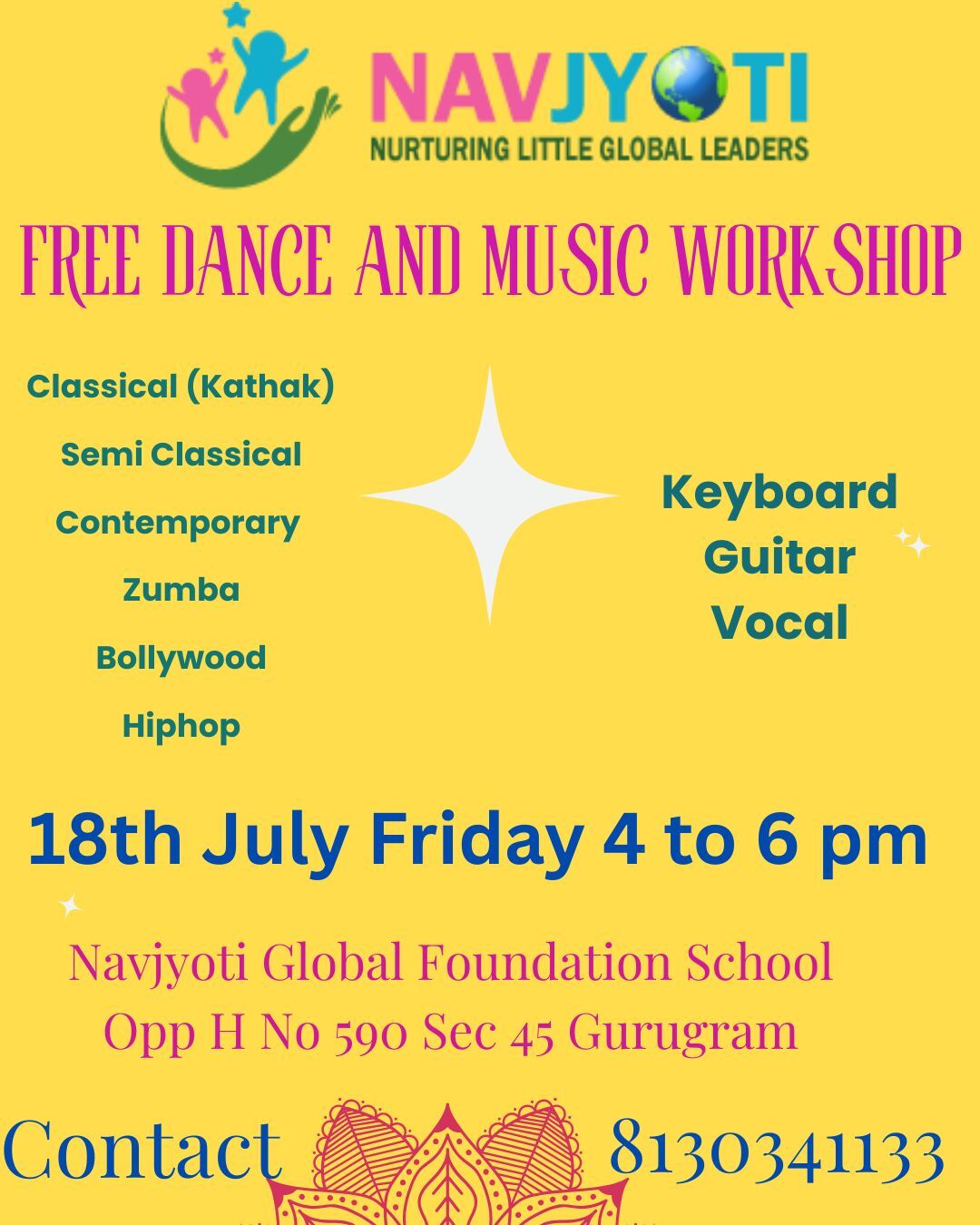 Navjyoti Global Foundation School invites children to a free Dance and Music Workshop . The event features an exciting range of sessions including Classical (Kathak), Semi-Classical, Bollywood, Contemporary, Hip Hop, Zumba, Vocal, Keyboard, and Guitar. Designed for kids , this fun-filled evening encourages creativity, rhythm, and artistic expression. A great opportunity to explore multiple performing arts in one place.